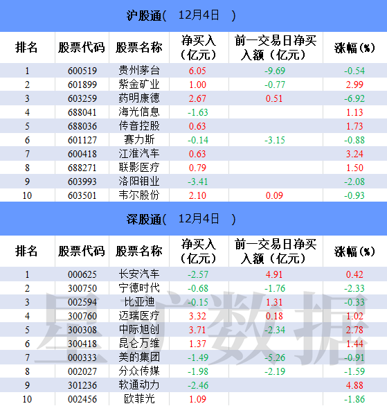 财联社12月4日电,北向资金净卖出14.41亿元,洛阳钼业、长安汽车、软通动力分别遭净卖出3.41亿元、2.57亿元、2.46亿元;贵州茅台逆势获净买入6.05亿元。