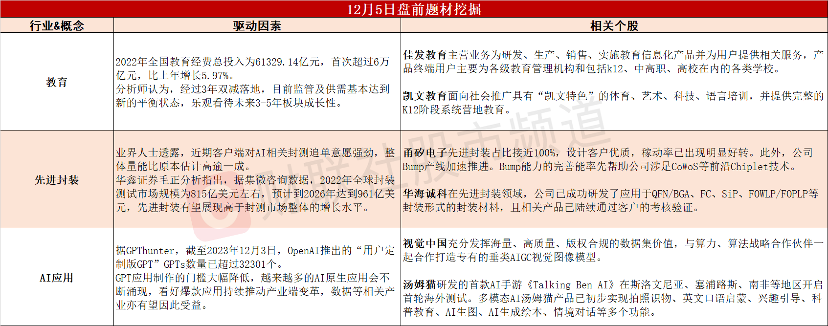 ①教育行业有望迎困境反转,分析师乐观看待未来3-5年成长性。②AI相关封测追单意愿强劲,先进封装或展现超高增长速度。③GPT应用制作门槛大幅降低,AI爆款应用有望打开行业成长空间。