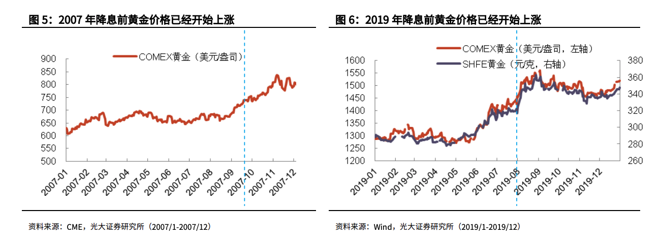 光大证券有色金属团队在12月3日发布的报告中指出,复盘2007年和2019年两轮降息周期,金价和黄金股在降息前均上涨明显。
