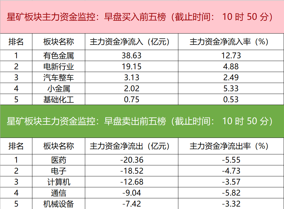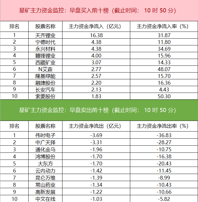 财联社12月6日电,财联社星矿数据显示,今日早盘主力资金净流入有色金属、电新行业、汽车整车等板块,净流出医药、电子、计算机等板块,其中有色金属板块净流入超38亿元。个股方面,天齐锂业涨停,主力资金净买入16.38亿元,宁德时代、永兴材料、赣锋锂业获主力资金净流入居前;伟时电子遭净卖出超3亿元,中广天择、通化金马、鸿博股份主力资金净流出额居前。