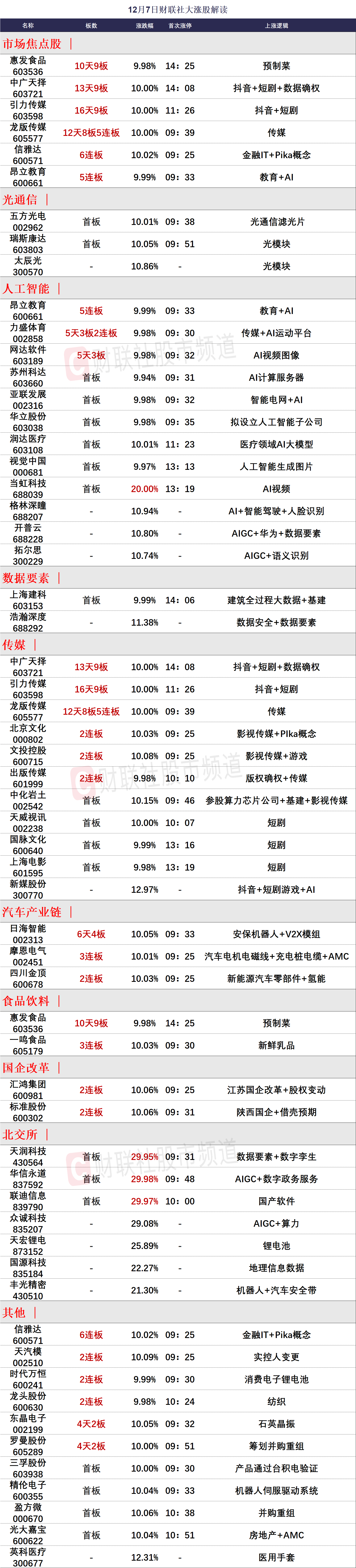 今日共42股涨停,连板股总数15只,15股封板未遂,封板率为74%(不含ST股、退市股及未开板新股)。个股方面,食品饮料板块惠发食品10天9板、一鸣食品3板,传媒股中广天择13天9板、引力传媒16天9板、龙版传媒12天8板,Pika概念股信雅达6板、北京文化2板,AI应用端的昂立教育5板、力盛体育5天3板、网达软件5天3板,机器人+智能驾驶的日海智能6天4板。今日收涨个股1724只,收跌个股3169只。