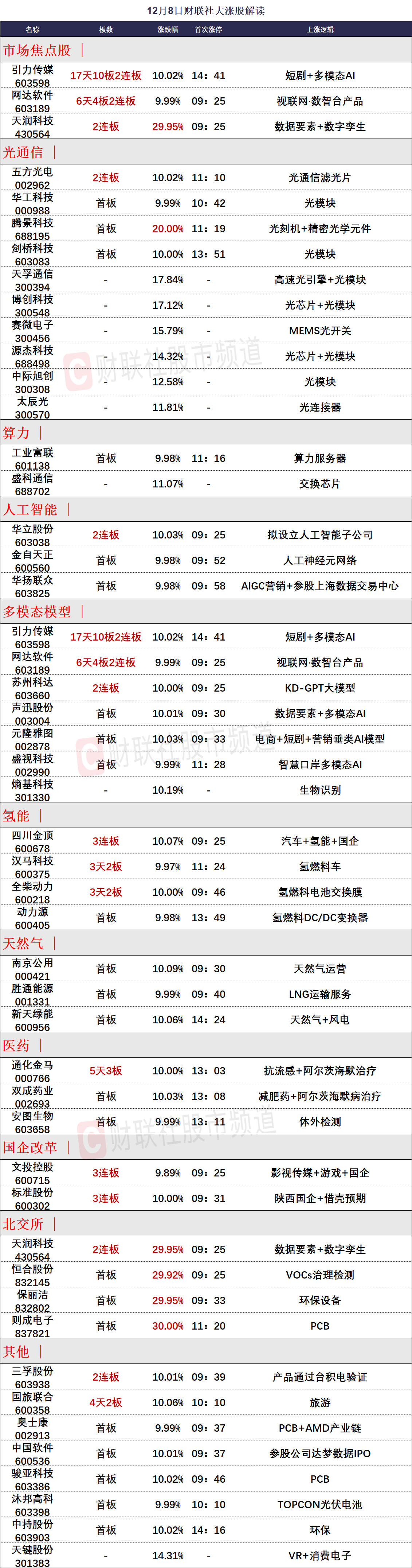 今日共37股涨停,连板股总数10只,18股封板未遂,封板率为67%(不含ST股、退市股及未开板新股)。个股方面,多模态AI概念股引力传媒17天10板、网达软件6天4板、苏州科达2板,国企改革板块文投控股3板、标准股份3板,氢能概念股四川金顶3板、全柴动力3天2板,医药股通化金马5天3板,北交所的天润科技2板,CPO板块五方光电2板、腾景科技科创板首板。今日收涨个股1316只,收跌个股3670只。