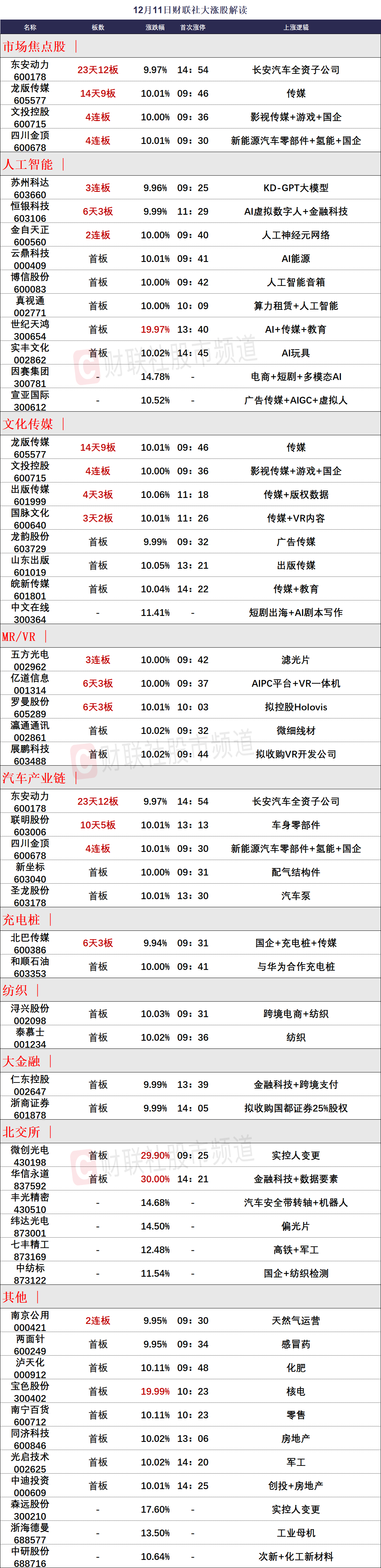 今日共41股涨停,连板股总数6只,17股封板未遂,封板率为71%(不含ST股、退市股及未开板新股)。个股方面,传媒板块龙版传媒14天9板、文投控股4板、出版传媒4天3板,汽车产业链的东安动力23天12板、联明股份10天5板、四川金顶4板,MR混合现实概念股五方光电3板、亿道信息6天3板、罗曼股份6天3板,人工智能板块苏州科达3板、恒银科技6天3板。今日收涨个股3913只,收跌个股1048只。
