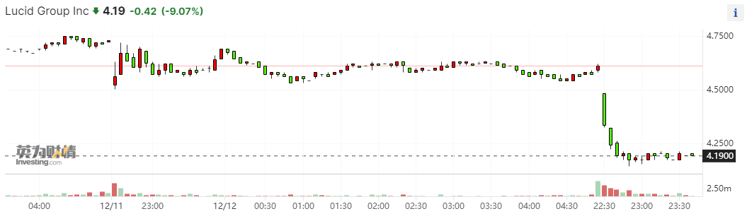 财联社12月12日讯(编辑 赵昊)周二(12月12日)美股开盘后不久,美国电动汽车制造商Lucid Motors股价一度暴跌近10%,最低报每股4.16美元。