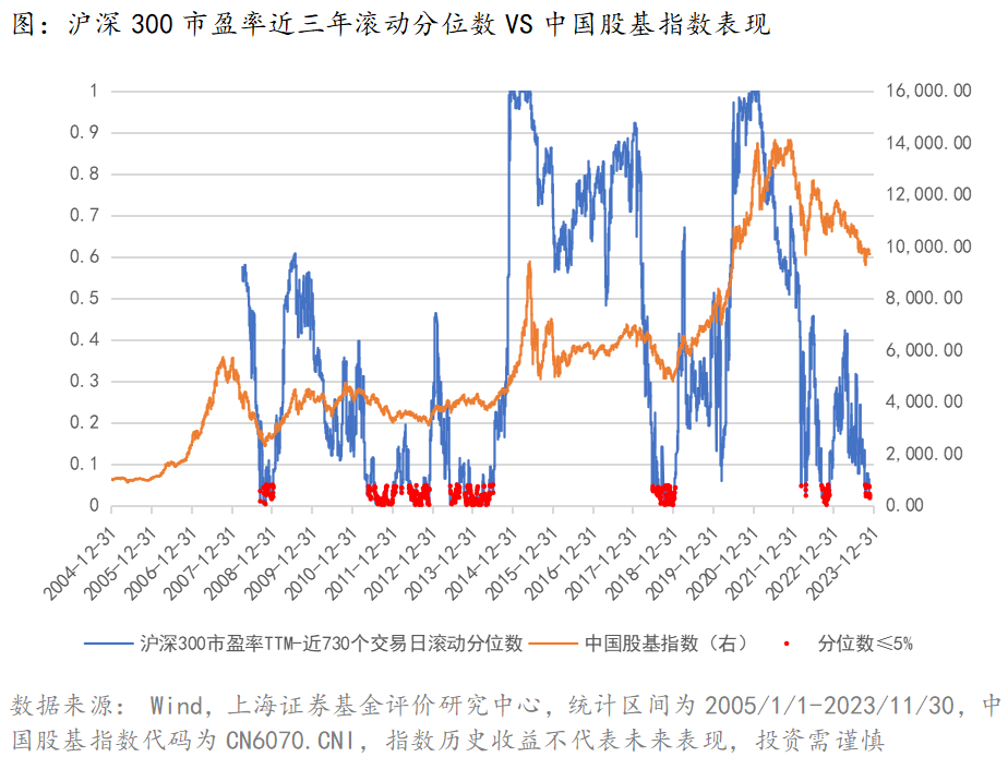 截至11月30日,沪深300的市盈率为10.97倍,处于近三年的2.33%分位水平,也就是说,当前的估值比过去三年里约98%的时间都更加“便宜”。回顾沪深300基期以来(2005/1/1),这个数值仅在688个交易日(占比18%)里低于5%。
