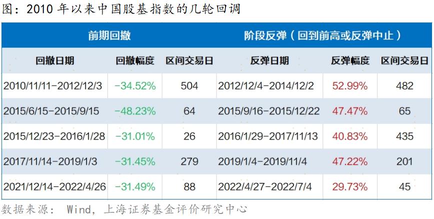 回顾2010年以来,中国股基指数经历过几轮幅度相似的回撤,从开始回撤到出现阶段性反弹,持续时间或长或短,主要受到不同的宏观经济和国内外形势的影响。