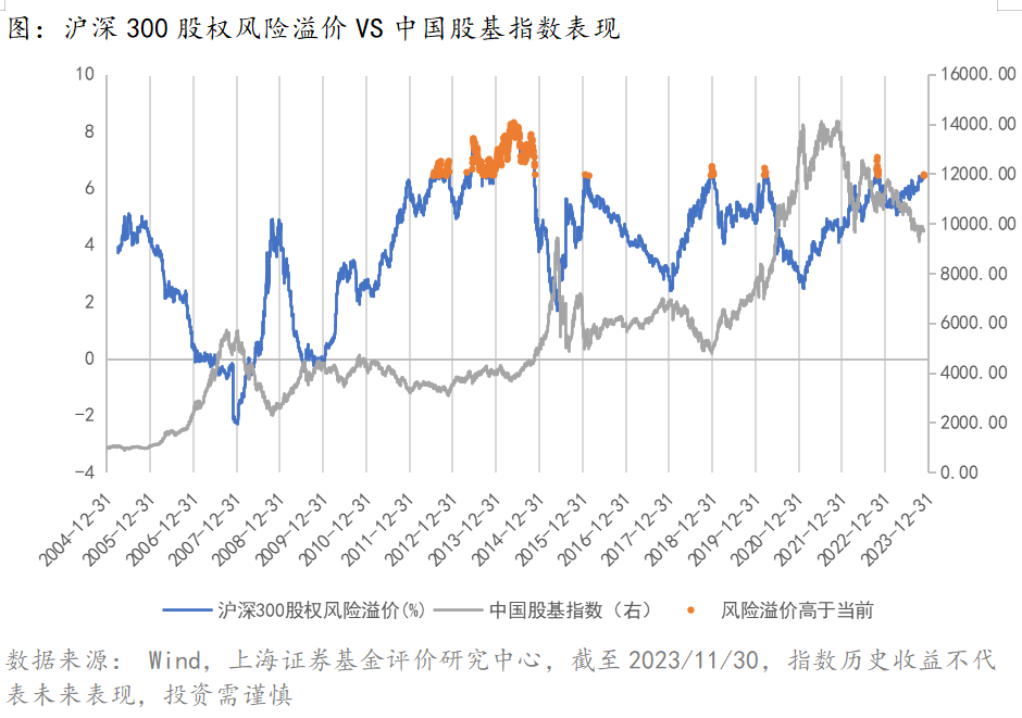 回顾历史上股权风险溢价高于当前的位置,主要分布在2012年、2013年、2018年、2020年、2022年的部分区间(下图标黄区域):