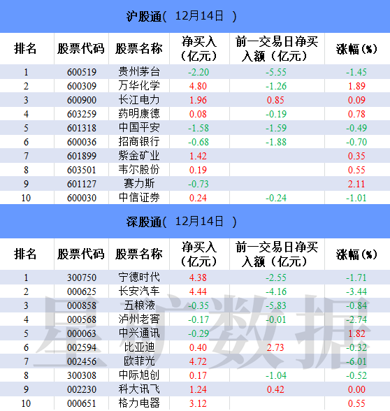 财联社12月14日电,北向资金今日净买入34.63亿元。万华化学、欧菲光、长安汽车分别获净买入4.8亿元、4.72亿元、4.44亿元。贵州茅台净卖出额居首,金额为2.2亿元。