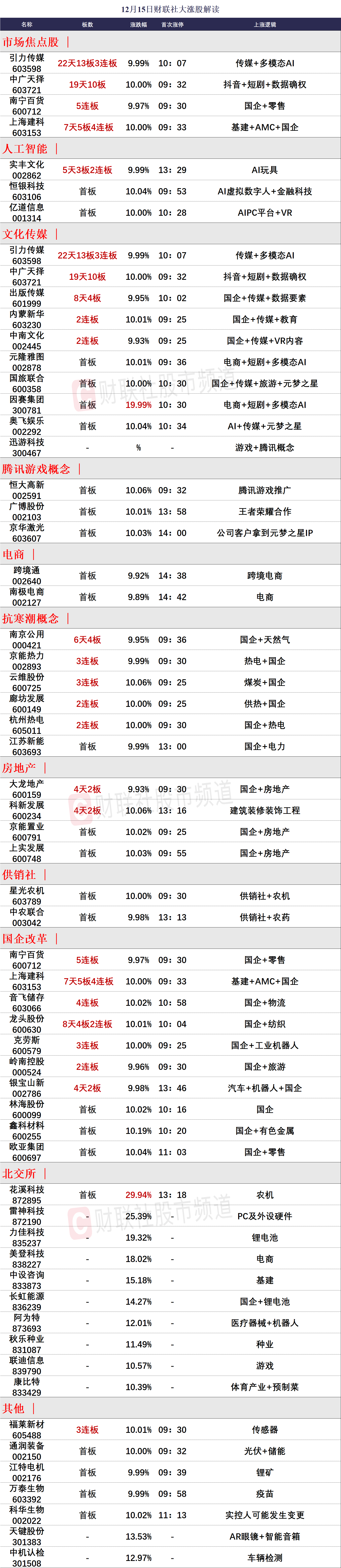 今日共45股涨停,连板股总数15只,15股封板未遂,封板率为75%(不含ST股、退市股及未开板新股)。个股方面,传媒股引力传媒22天13板、中广天择19天10板、出版传媒8天4板,国企改革板块南宁百货5板、上海建科7天5板、音飞储存4板,抗寒潮概念股南京公用6天4板、京能热力3板、云维股份3板,机器人传感器的福莱新材3板,AI玩具概念的实丰文化5天3板。今日收涨个股1498只,收跌个股3394只。