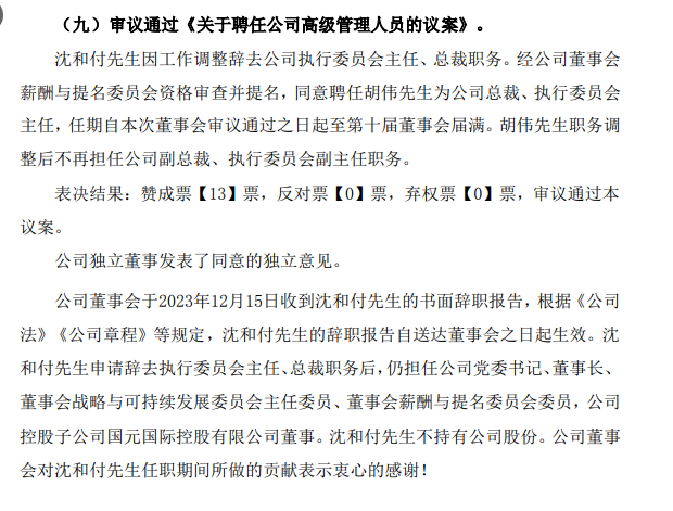 12月15日,国元证券发布公告,经董事会决议,副总裁胡伟正式获聘任为公司总裁、执委会主任,公司董事长沈和付不再兼任上述职位。