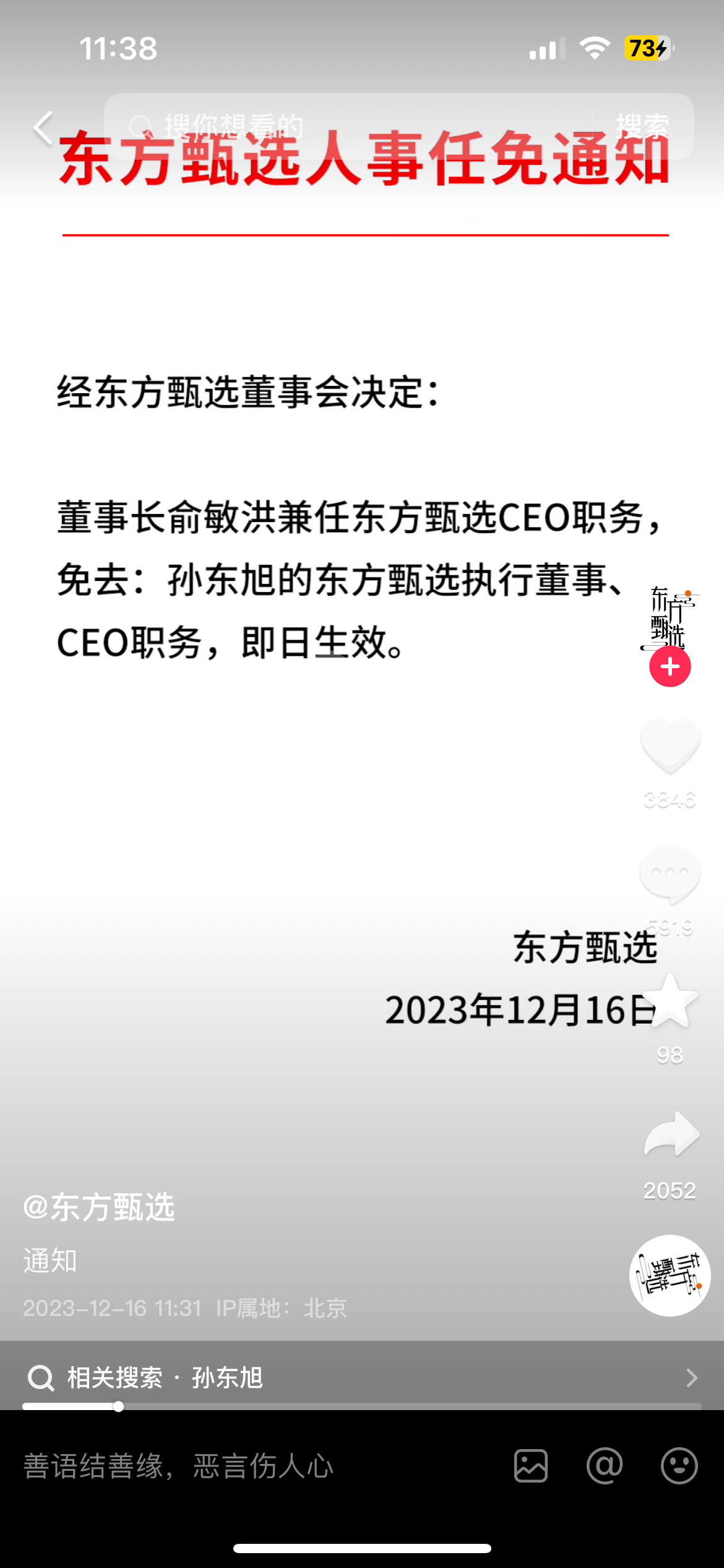 今日上午11点31分,东方甄选抖音账号发布人事任免通知,经东方甄选董事会决定,董事长俞敏洪兼任东方甄选CEO职务,免去孙东旭的东方甄选执行董事、CEO职务,即日生效。