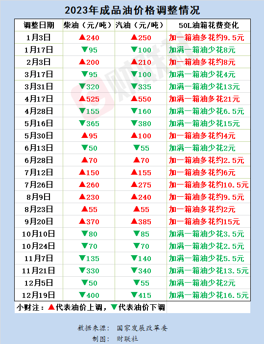 财联社12月19日电,据国家发改委通知,从12月19日24时起,国内汽、柴油每吨分别下调415元和400元,这也是国内成品油价格连续第六次下调。全国平均来看:92号汽油每升下调0.33元;95号汽油每升下调0.34元;0号柴油每升下调0.34元。按一般家用汽车油箱50L容量估测,加满一箱92号汽油,将少花16.5元。2023年全年,汽柴油价格累计每吨下调50元。