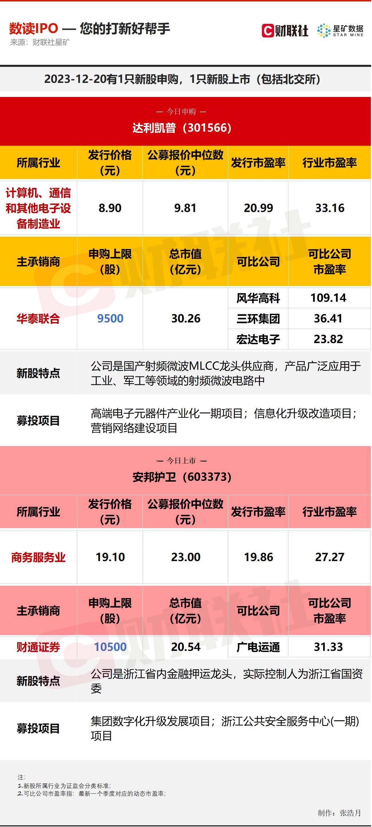 财联社12月20日电,今日有1只新股申购,为创业板的达利凯普;1只新股上市,为沪市主板的安邦护卫。