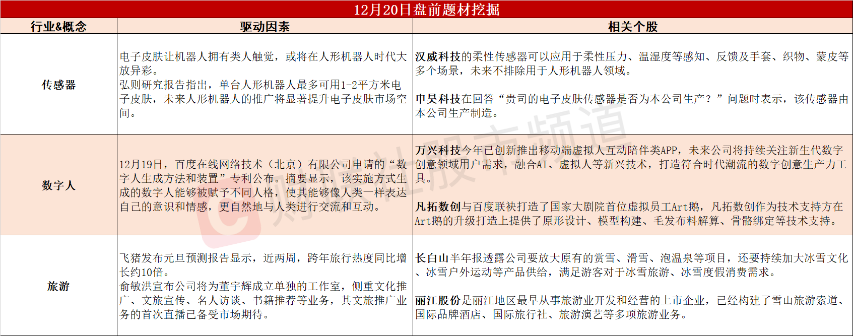 ①特斯拉给出方向指引,人形机器人将显著提升电子皮肤使用量。②百度最新专利可赋予数字人不同人格,AI+数字人迈向高速发展期。③跨年旅行热度同比增长10倍,旅游行业有望迎来强劲复苏。