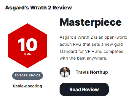 日前,VR游戏《阿斯加德之怒2(Asgard's Wrath 2)》上线,并在12月15日登陆Meta Quest2/3/Pro平台,时长90多个小时,售59.99美元。知名游戏评测机构IGN打出满分(10分)好评,Metacritic(M站)本作均分93(收录10家媒体评分)。
