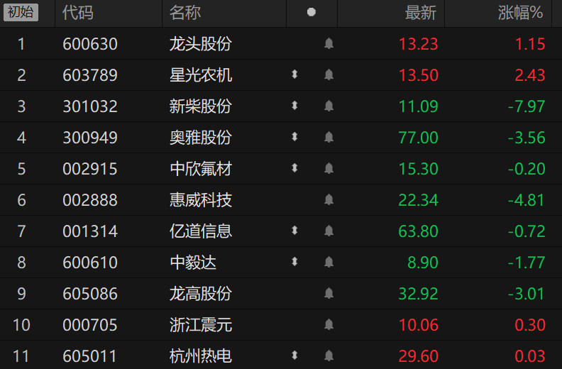 财联社12月21日电,市场焦点股龙头股份(11天6板)高开1.15%,农机股星光农机(4板)高开2.43%、新柴股份(创业板首板)低开7.97%,采购算力服务器的奥雅股份(创业板3板)低开3.56%,PEEK概念股中欣氟材(3板)低开0.20%,消费电子板块惠威科技(3板)低开4.81%、亿道信息(4天3板)低开0.72%,国企改革板块中毅达(5天3板)低开1.77%、龙高股份(6天3板)低开3.01%、浙江震元(6天3板)高开0.30%,电力股杭州热电(5天3板)高开0.03%。