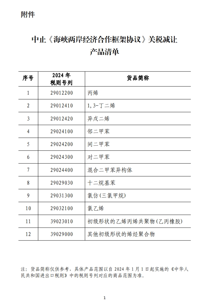 财联社12月21日电,据国务院关税税则委员会办公室公告,台湾地区单方面对大陆产品出口采取歧视性的禁止、限制等措施,违反了《海峡两岸经济合作框架协议》规定。根据《海峡两岸经济合作框架协议》,国务院关税税则委员会发布公告,决定中止《海峡两岸经济合作框架协议》部分产品关税减让,自2024年1月1日起,对原产于台湾地区的丙烯、对二甲苯等12个税目进口产品,中止适用《海峡两岸经济合作框架协议》协定税率,按现行有关规定执行。希望台湾地区采取有效措施,取消对大陆的贸易限制。