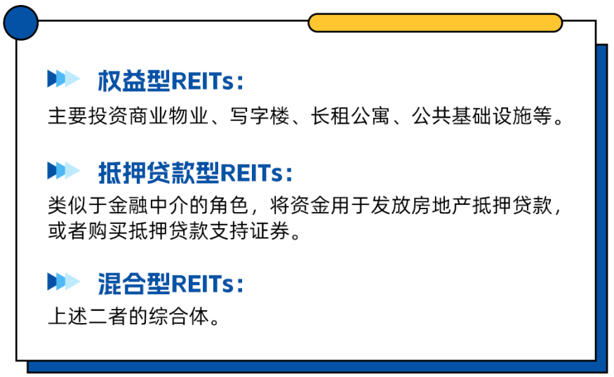 即REITs买了什么。根据投资对象的不同,目前REITs在国外可以分为权益型、抵押贷款型和混合型三类。
