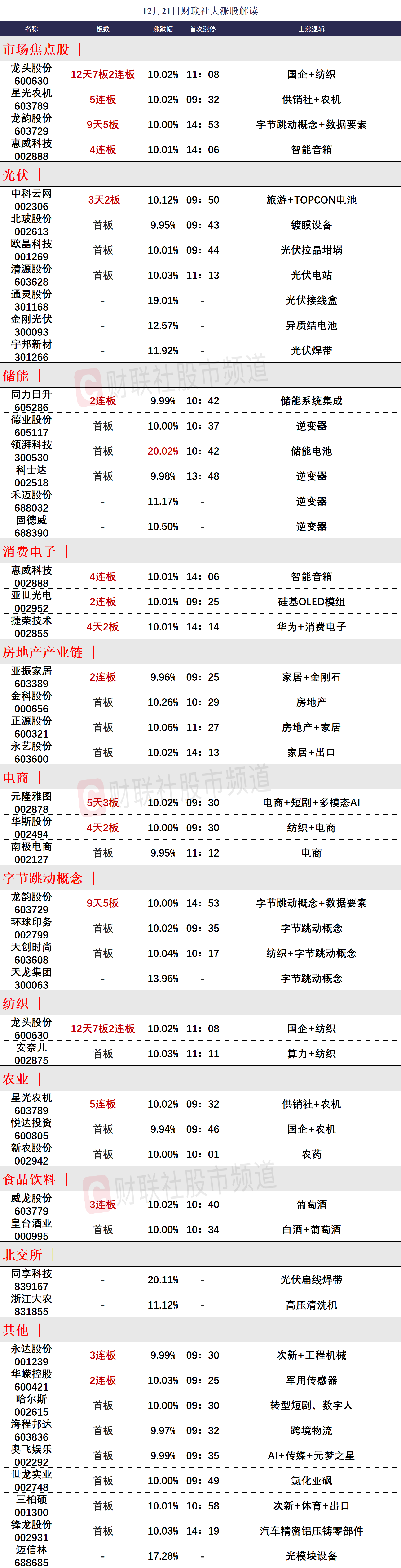 今日共36股涨停,连板股总数9只,14股封板未遂,封板率为72%(不含ST股、退市股及未开板新股)。个股方面,纺织股龙头股份12天7板,农机股星光农机5板,字节跳动概念股龙韵股份9天5板,消费电子板块惠威科技4板、亚世光电2板,次新+工程机械的永达股份3板,电商板块元隆雅图5天3板、华斯股份4天2板,储能板块同力日升2板、领湃科技创业板首板,传感器概念股华嵘控股2板。今日收涨个股3533只,收跌个股1341只。