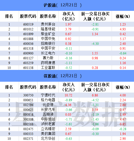 财联社12月21日电,北向资金净买入12.03亿元,宁德时代、比亚迪、隆基绿能分别获净买入10.72亿元、4.36亿元、3.79亿元。长安汽车净卖出额居首,金额为3.66亿元。