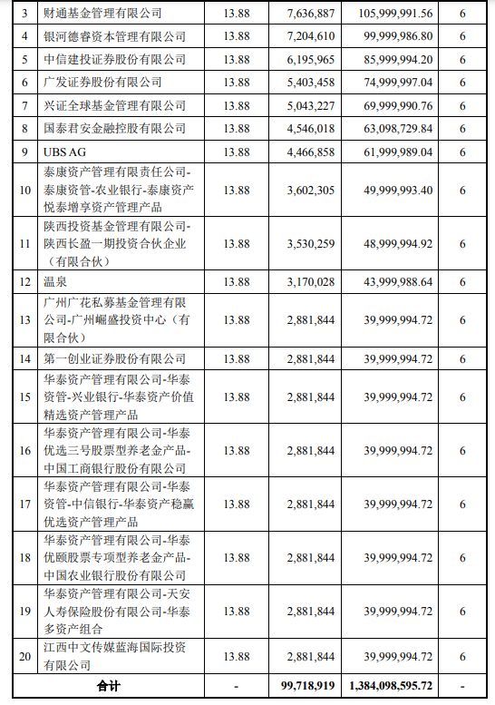 财联社12月21日电,国光电器公布2023年度向特定对象发行股票发行情况报告书,确定本次发行价格为13.88元/股,发行股票数量为9971.8919万股,募集资金总额约为13.84亿元。本次发行最终获配发行对象共计20名,获配情况如下。