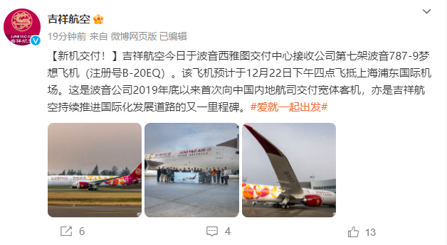 财联社12月22日电,吉祥航空官方微博今日上午宣布,今日于波音西雅图交付中心接收公司第七架波音787-9梦想飞机(注册号B-20EQ)。该飞机预计于12月22日下午四点飞抵上海浦东国际机场。这是波音公司2019年底以来首次向中国内地航司交付宽体客机。