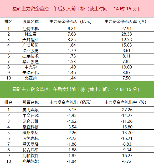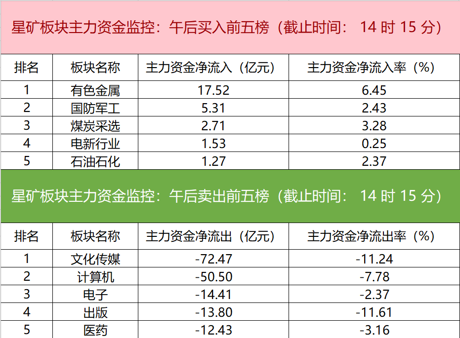 财联社12月22日电,财联社星矿数据显示,今日主力资金净流入有色金属、国防军工、煤炭采选等板块,净流出文化传媒、计算机、电子等板块,其中文化传媒板块净流出72.47亿元。个股方面,江特电机一度涨停,主力资金净买入8.21亿元,N宏盛、天齐锂业、广博股份获主力资金净流入居前;奥飞娱乐遭净卖出超5亿元,中文在线、昆仑万维、掌趣科技等主力资金净流出额居前。