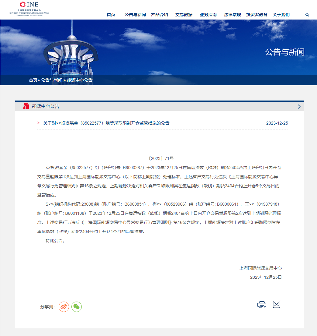 财联社12月25日电,上海国际能源交易中心公告,××投资基金(85022577)组(账户组号: B6000267)于2023年12月25日在集运指数(欧线)期货2404合约上账户组日内开仓交易量超限第1次达到上海国际能源交易中心(以下简称上期能源)处理标准。上述客户交易行为违反《上海国际能源交易中心异常交易行为管理细则》第16条之规定,上期能源决定对相关客户采取限制其在集运指数(欧线)期货2404合约上开仓5个交易日的监管措施。S××(组织机构代码:23008)组(账户组号:B6000854)、梅××(00529966)组(账户组号: B6000061)、王××(01987948)组(账户组号: B6001108)于2023年12月25日在集运指数(欧线)期货2404合约上日内开仓交易量超限第2次达到上期能源处理标准。上述交易行为违反《上海国际能源交易中心异常交易行为管理细则》第16条之规定,上期能源决定对上述账户组采取限制其在集运指数(欧线)期货2404合约上开仓1个月的监管措施。