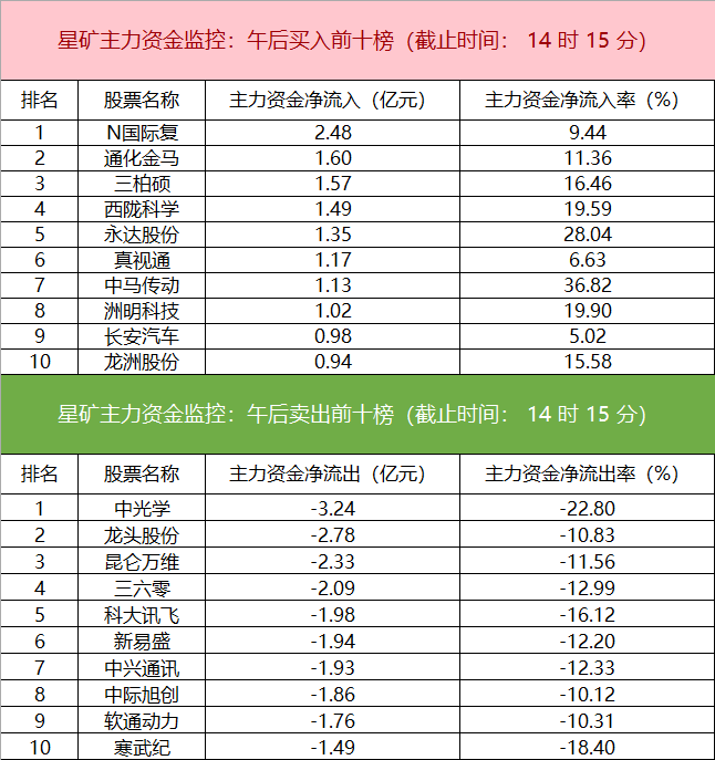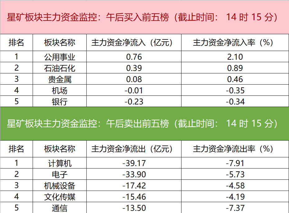 财联社12月26日电,财联社星矿数据显示,今日主力资金净流入公用事业、石油石化、贵金属等板块,净流出计算机、电子、机械设备等板块,其中计算机板块净流出39.17亿元。个股方面,N国际复大涨,主力资金净买入2.48亿元,通化金马、三柏硕、西陇科学获主力资金净流入居前;中光学遭净卖出超3亿元,龙头股份、昆仑万维、三六零等主力资金净流出额居前。