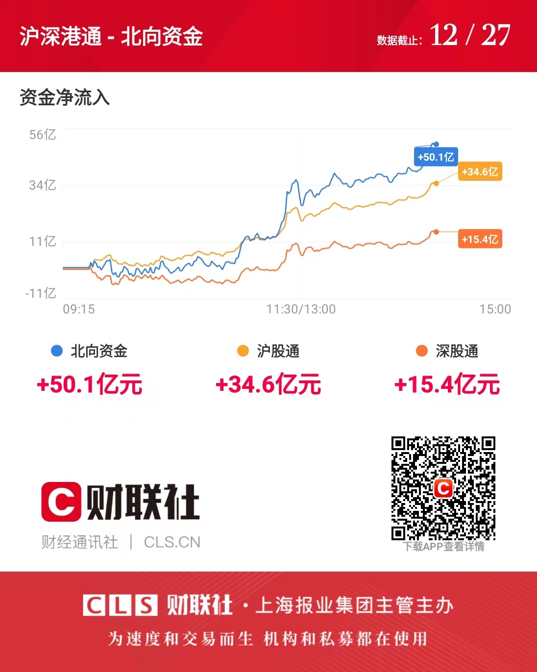 财联社12月27日电,截至发稿,北向资金净流入超50亿元,其中,沪股通净流入超34亿元,深股通净流入超15亿元。