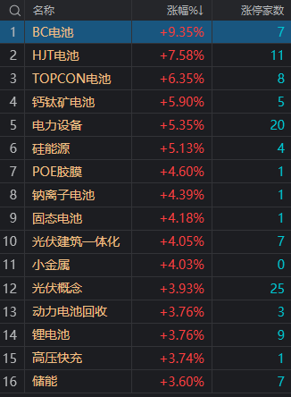 财联社12月28日电,市场早盘低开高走,创业板指领涨。盘面上,光伏等赛道股集体爆发,隆基绿能、迈为股份、清源股份、赛伍技术、爱旭股份等逾20只个股涨停,此外锂电、风电板块均跟随走强。消费股展开反弹,中国中免涨近7%,舍得酒业涨超5%。券商等金融股震荡走强,华鑫股份涨停。下跌方面,龙字辈等高位股继续调整,龙韵股份、威龙股份等跌停。总体上个股涨多跌少,全市场超4500只个股上涨。沪深两市今日成交额5391亿,较上个交易日放量1497亿。板块方面,BC电池、锂矿、储能、民爆等板块涨幅居前,煤炭、港口、养殖等板块跌幅居前。截至收盘,沪指涨1.11%,深成指涨2.34%,创业板指涨3.34%。北向资金方面,沪股通早盘净流入50.6亿,深股通早盘净流入64.49亿。