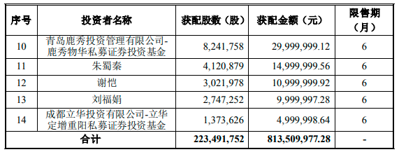 财联社12月28日电,福星股份公布向特定对象发行股票发行情况报告书,本次发行股份数量2.23亿股,募集资金总额约8.14亿元,本次发行价格为3.64元/股。本次发行对象最终确定为14家,具体配售情况如下。
