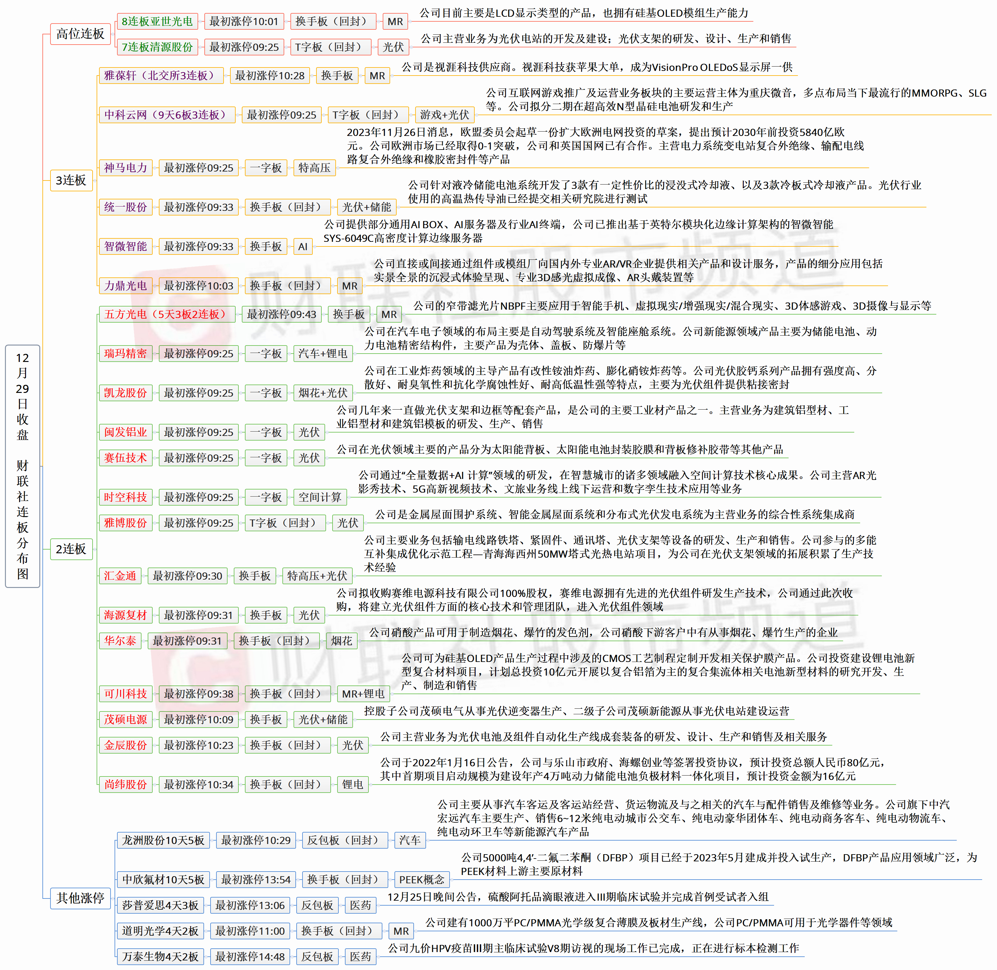 今日共65股涨停,连板股总数22只,其中三连板及以上个股8只,上一交易日共11只连板股,连板股晋级率72.72%(不含ST股、退市股及未开板新股)。个股方面,市场连续第三日迎普涨行情,两市超4100只个股上涨,短线情绪极其活跃,连板股家数为2023年内第三高。高位股方面,虽然亚世光电与清源股份双双收到交易所监管函,但依旧成功晋级,其中亚世光电将连板高度拓展至8连板。板块方面,MR混合现实板块全面爆发,亚世光电8板、雅葆轩北交所30CM3连板,易天股份、联建光电、清越科技20CM涨停,作为硕果仅存的强势题材,在本轮反弹过程中,不断有资金加仓MR板块,试图将其打造成市场主线,不过值得注意的是,消费电子板块历史上多有利好兑现的“传统”,随着苹果MR发售日期日益临近,板块风险不容忽视。