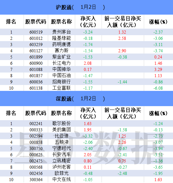 财联社1月2日电,北向资金今日大幅净卖出52.69亿元。比亚迪、贵州茅台、宁德时代分别获净卖出3.32亿元、3.24亿元、2.4亿元。长江电力净买入额居首,金额为2.08亿元。