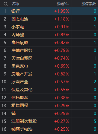 财联社1月5日电,市场早盘震荡调整,沪指一度冲高,创业板指再创调整新低。盘面上,银行股盘中异动,瑞丰银行一度涨停,中信银行涨近5%。固态电池概念股开盘大涨,德福科技、新纶新材、金龙羽涨停。房地产板块震荡反弹,津投城开、云南城投涨停。冰雪产业概念股反复活跃,大连圣亚、长白山涨停。下跌方面,军工股陷入调整,中航重机跌超8%。总体上个股跌多涨少,全市场超4000只个股下跌。沪深两市今日成交额4416亿,较上个交易日放量285亿。板块方面,银行、固态电池、房地产、冰雪产业等板块涨幅居前,CPO、国防军工、卫星导航、传媒等板块跌幅居前。截至收盘,沪指跌0.13%,深成指跌0.24%,创业板指跌0.61%。北向资金方面,沪股通早盘净流入9.15亿,深股通早盘净流出12.15亿。