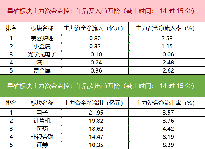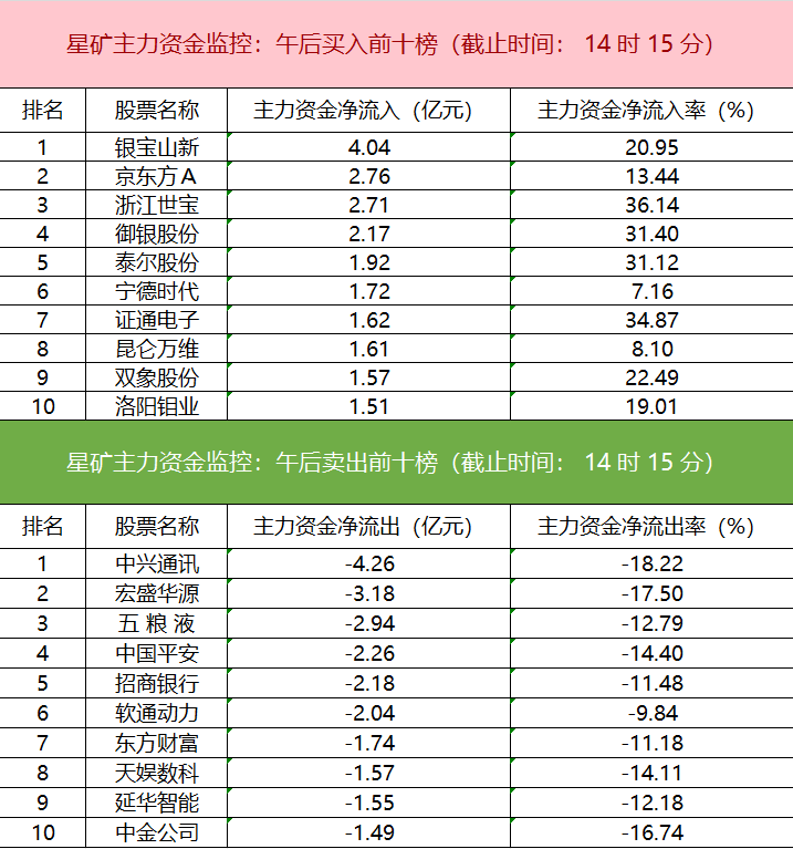 财联社1月4日电,财联社星矿数据显示,午后仅美容护理和小金属两个板块主力资金呈净流入状态,电子、计算机、医药等板块净流出居前,其中电子板块净流出21.95亿元。个股方面,银宝山新主力资金净买入4.04亿元位居首位,京东方A、浙江世宝、御银股份获主力资金净流入居前;中兴通讯遭净卖出4.26亿元居净流出首位,宏盛华源、五粮液、中国平安等主力资金净流出额居前。