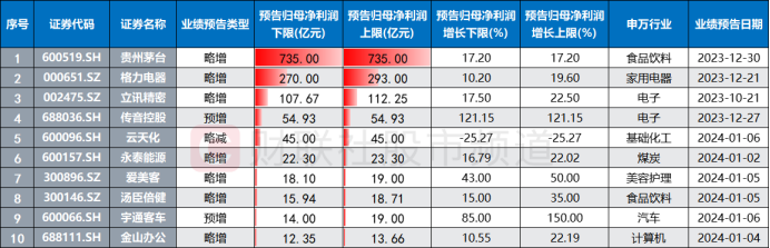 具体个股来看,以归母净利润下限数据统计,贵州茅台以735亿元的盈利规模暂居首位,格力电器、立讯精密2023年也双双赚超百元利润,传音控股、云天化、永泰能源、爱美客、汤臣倍健等股业绩规模也相对居前。若从业绩增速(归母净利润下限)上看,银禧科技因业绩扭亏而大增近6倍,飞龙股份、山外山、传音控股、云意电气、冰川网络业绩增速也均超100%。