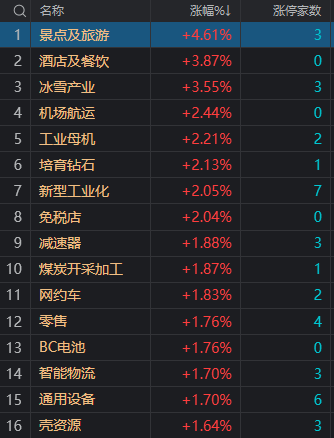 财联社1月9日电,市场早盘震荡反弹,三大指数均小幅上涨,沪指一度创出阶段新低。盘面上,旅游、冰雪产业概念股持续活跃,长白山6连板,大连圣亚5连板,九华旅游涨停。机器人概念股开盘大涨,爱仕达、思进智能、泰尔股份、新时达等10余只个股涨停。光伏概念股探底回升,京山轻机、公元股份涨停,锦浪科技涨超10%。煤炭股盘中拉升,安源煤业涨停。下跌方面,MR概念股陷入调整,亚世光电跌停。总体上个股涨多跌少,全市场超3800只个股上涨。沪深两市今日成交额4241亿,较上个交易日放量212亿。板块方面,旅游、机器人、BC电池、煤炭等板块涨幅居前,鸿蒙、MR、国资云、航运等板块跌幅居前。截至收盘,沪指涨0.34%,深成指涨0.36%,创业板指涨0.48%。北向资金方面,沪股通早盘净流入12.91亿,深股通早盘净流出0.98亿。