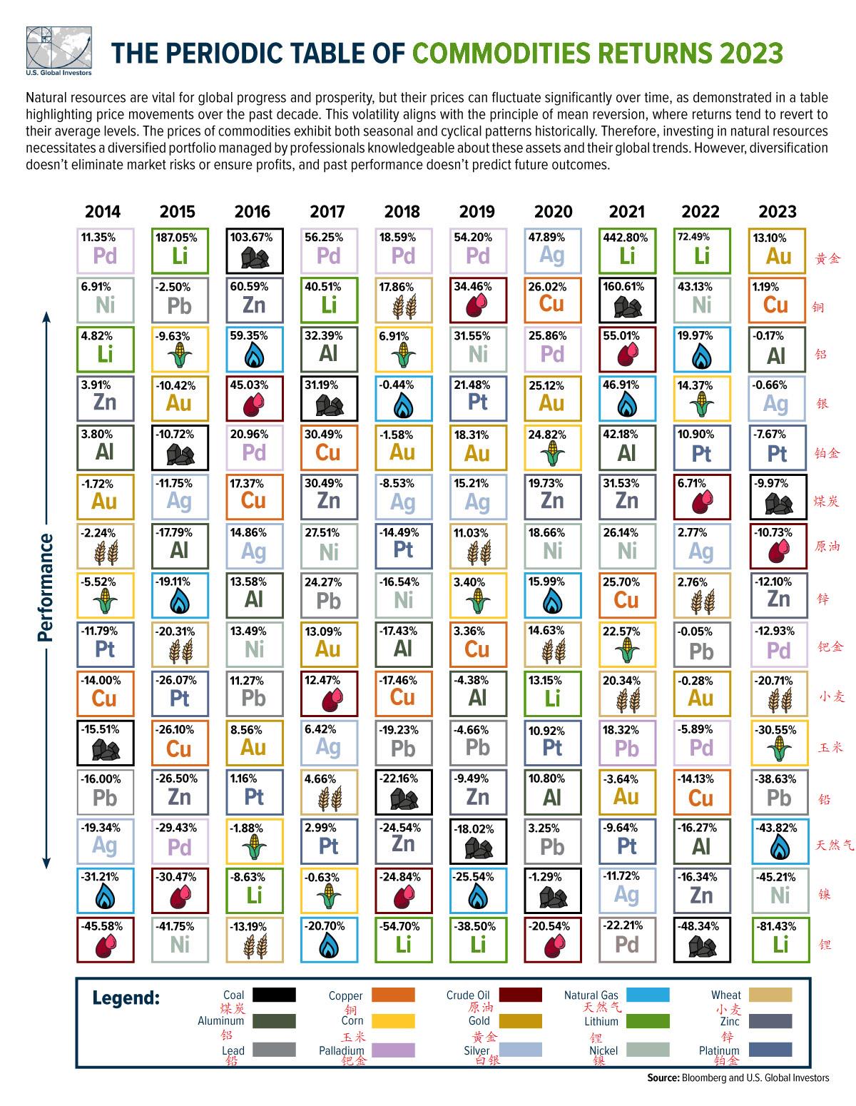 财联社1月9日电,自然资源对全球发展和繁荣至关重要,但大宗商品的价格往往会随着时间的推移而大幅波动,下面这张过去十年(2014年-2023年)的年度价格涨跌排行榜就揭示出了这一点。从历史上看,商品价格呈现出一定的季节性和周期性模式,正契合均值回归原理。