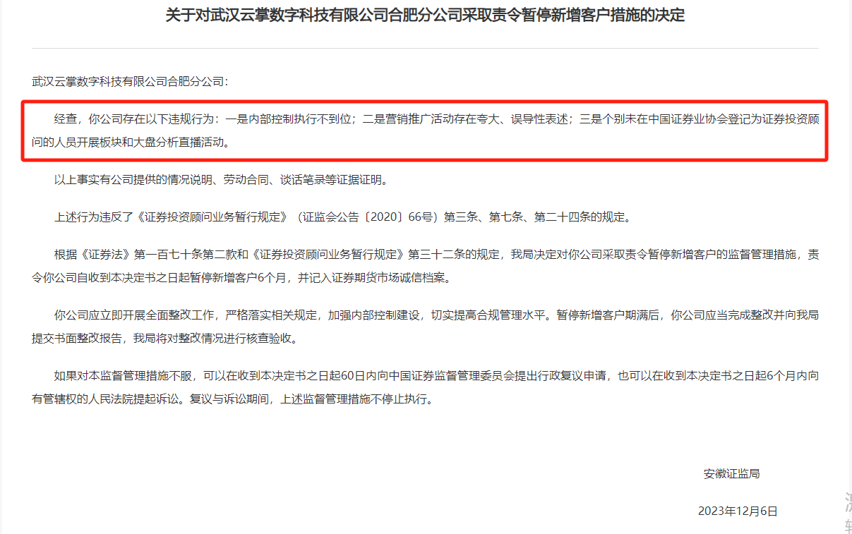 云掌数科合肥分公司存在以下违规行为,一是内部控制执行不到位;二是营销推广活动存在夸大、误导性表述;三是个别未在中证协登记为证券投顾的人员开展板块和大盘分析直播活动。