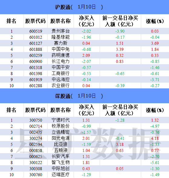 财联社1月10日电,北向资金今日净买入6.9亿元。药明康德、阳光电源、智飞生物分别获净买入2.09亿元、2.01亿元、1.81亿元。长江电力净卖出额居首,金额为2.07亿元。