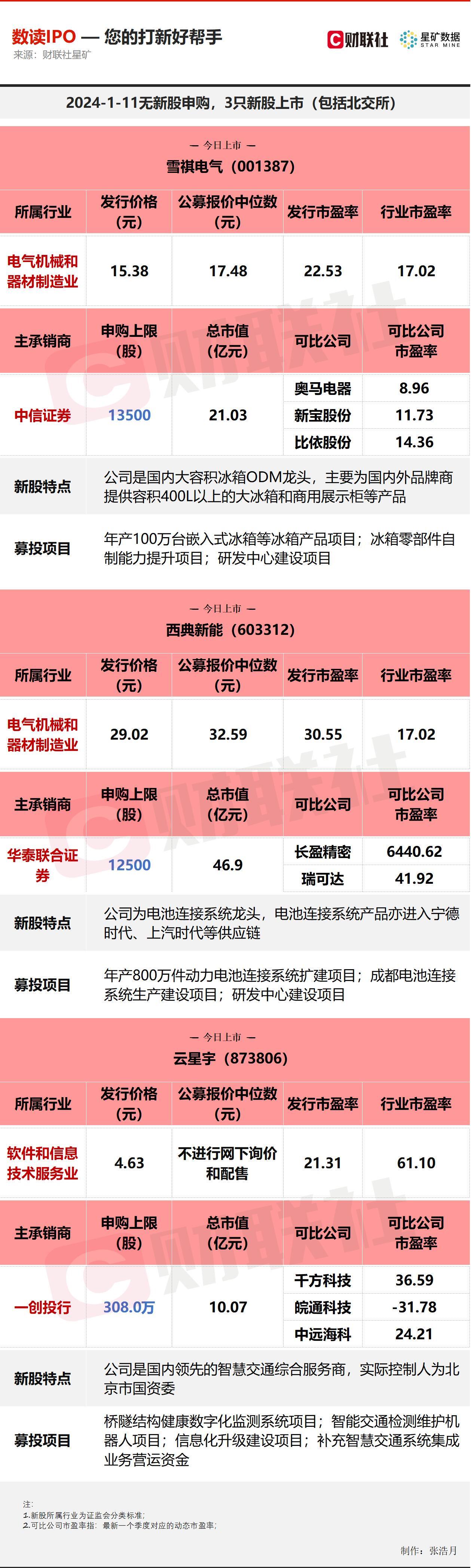 财联社1月11日电,今日无新股申购;3只新股上市,分别为深交所的雪祺电气,沪市主板的西典新能,北交所的云星宇。