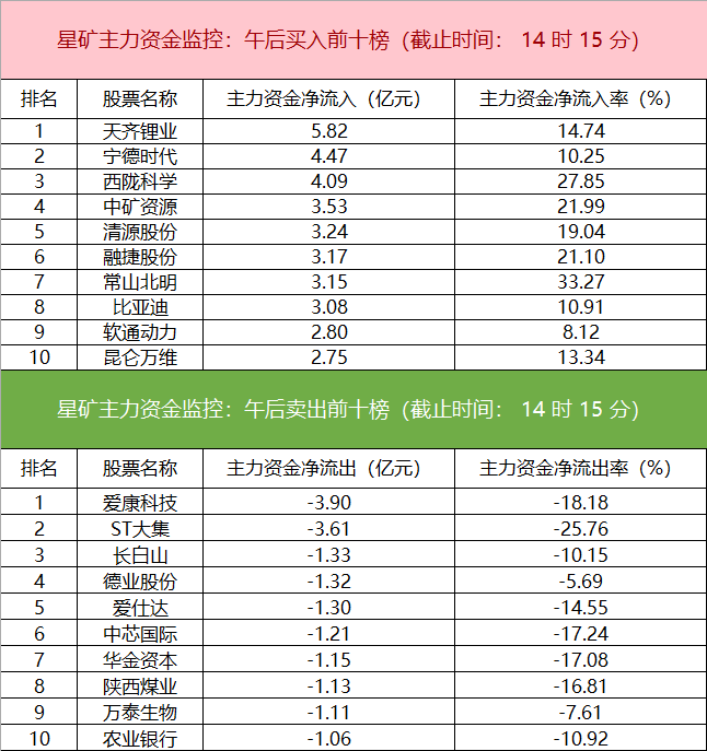 财联社1月11日电,财联社星矿数据显示,今日主力资金净流入计算机、有色金属、电子等板块,净流出商贸零售、煤炭采选、石油石化等板块,其中计算机板块净流入31.31亿元。个股方面,天齐锂业大涨,主力资金净买入5.82亿元位居首位,宁德时代、西陇科学、中矿资源获主力资金净流入居前;爱康科技遭净卖出3.90亿元居净流出首位,ST大集、长白山、德业股份等主力资金净流出额居前。