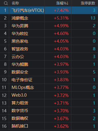 财联社1月11日电,市场全天震荡反弹,创业板指领涨。盘面上,鸿蒙概念股集体走强,亚华电子、创识科技、常山北明、传智教育、立达信等10余股涨停。锂电池等新能源赛道股午后走高,艾罗能源、融捷股份、中矿资源、金龙羽等涨停。飞行汽车概念股盘中大涨,光洋股份、王子新材、万丰奥威涨停。算力、数据要素概念股迎来反弹,直真科技、高新发展、深桑达A涨停。下跌方面,石化概念股陷入调整,新凤鸣跌停。总体上个股涨多跌少,全市场超4400只个股上涨。沪深两市今日成交额7121亿,较上个交易日放量651亿。板块方面,飞行汽车、鸿蒙概念、算力租赁、锂矿等板块涨幅居前,供销社、煤炭、旅游等板块跌幅居前。截至收盘,沪指涨0.31%,深成指涨1.47%,创业板指涨1.95%。北向资金全天净买入42.31亿,其中沪股通净卖出2.11亿元,深股通净买入44.42亿元。