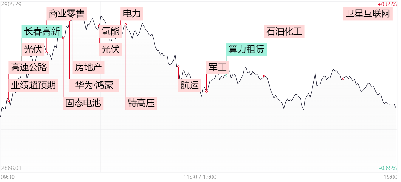 上个交易日,三大股指集体低开,光伏、锂电池等新能源赛道继续强者恒强,银行、房地产等权重股也表现不俗,沪指一度收复2900点,但随后股指遇阻并再度震荡回落,午后进一步退潮,创业板指跌近1%。沪深两市成交额6767亿,缩量354亿。1)环保板块早盘强势崛起,大千生态、节能铁汉、正和生态、东华科技涨停,中电环保、科净源、启迪环境等涨幅靠前。消息面上,中共中央、国务院关于全面推进美丽中国建设的意见印发。2)光伏板块继续逆势大涨,清源股份走出16天10板奠定其高人气,公元股份、耀皮玻璃、联泓新科、绿康生化、中旗新材涨停,聆达股份、帝科股份、海优新材、鹿山新材等涨幅靠前。在逆变器分支此前大放异彩后,近期胶膜、玻璃等辅材方向在光伏产业链中领涨,仍主要以海外装机目标和增速的持续超预期驱动为主。3)光伏板块的持续大涨也扩散到了电网设备、电力等方向,电力股华银电力、长源电力和智能电网股大连电瓷、江苏华辰涨停。德邦证券研报指出, 随着欧盟电网不断升级改造,各国输电电网不断打通,开关类产品、变压器以及变电站周围设备等的需求可能上升。4)军工、卫星导航板块午后异动,利君股份、万方发展、上海沪工涨停,中科海讯一度触及20CM涨停,天银机电、天海防务、中国卫星等涨幅靠前。中信建投表示,目前是军工板块估值、业绩增速以及资金配置的三重底部。“十四五”后期订单有望逐步下发,积压叠加新增需求,2024年行业订单和业绩增速有望企稳回升。