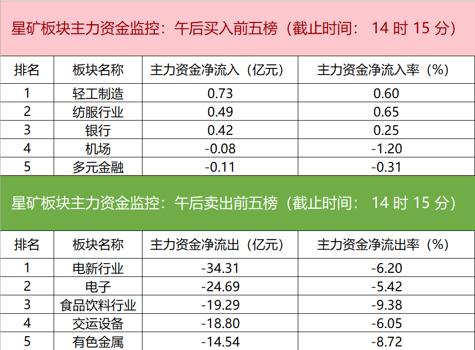财联社1月17日电,财联社星矿数据显示,今日主力资金净流入轻工制造、纺服行业、银行等板块,净流出电新行业、电子、食品饮料行业等板块,其中电新行业净流出34.31亿元。个股方面,招商银行上涨,主力资金净买入2.50亿元位居首位,浪潮信息、广博股份、平潭发展获主力资金净流入居前;贵州茅台遭净卖出9.25亿元居净流出首位,长安汽车、隆基绿能、比亚迪等主力资金净流出额居前。