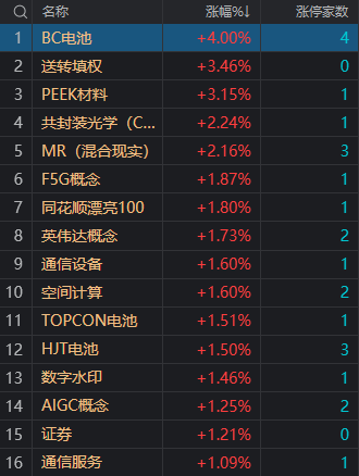 财联社1月18日电,市场午后V型反弹,沪指2800点失而复得,创业板指数领涨。盘面上,权重股尾盘集体走强带动指数反弹,中国移动、贵州茅台、中国平安、五粮液等涨超2%。大金融股盘中异动,新力金融涨停,湘财股份一度涨停。光伏概念股再度活跃,TCL中环、爱旭股份、清源股份、晶澳科技等多股涨停。AI概念股迎来反弹,CPO方向领涨,联特科技、中际旭创、万兴科技涨超10%,剑桥科技涨停。下跌方面,旅游等消费股陷入调整,大连圣亚跌停。总体上个股跌多涨少,全市场超3500只个股下跌。沪深两市今日成交额8648亿,较上个交易日放量2272亿。板块方面,BC电池、CPO、MR、证券等板块涨幅居前,旅游、乳业、石油、零售等板块跌幅居前。截至收盘,沪指涨0.43%,深成指涨1%,创业板指涨1.93%。北向资金全天净卖出7.41亿,其中沪股通净买入10.52亿元,深股通净卖出17.93亿元。