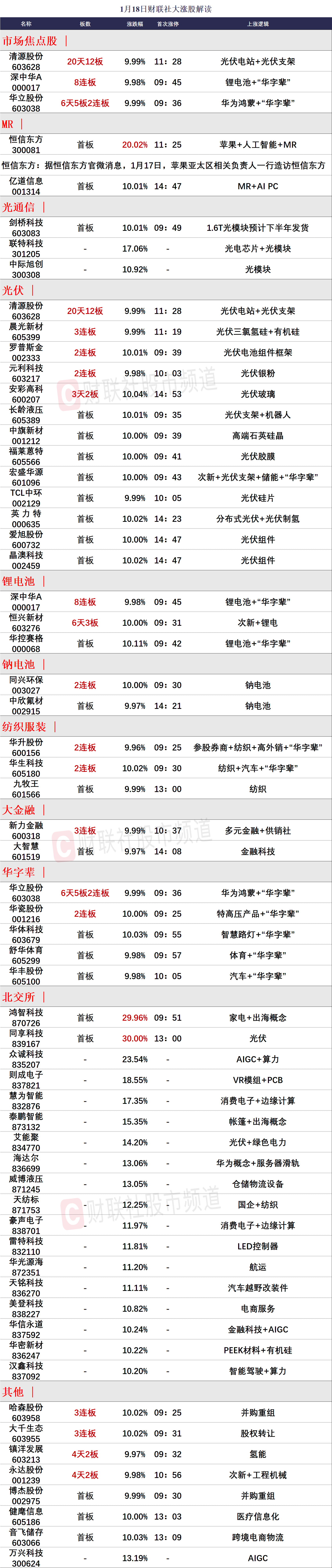 今日共40股涨停,连板股总数12只,9股封板未遂,封板率为82%(不含ST股、退市股及未开板新股)。个股方面,光伏板块清源股份20天12板、晨光新材3板、罗普斯金2板,“华字辈”个股深中华A8板、华立股份6天5板、华瓷股份2板,大金融板新力金融3板,并购重组的哈森股份3板,股权转让的大千生态3板,纺织股华升股份2板、华生科技2板。今日沪深两市收涨个股1438只,收跌个股3531只。