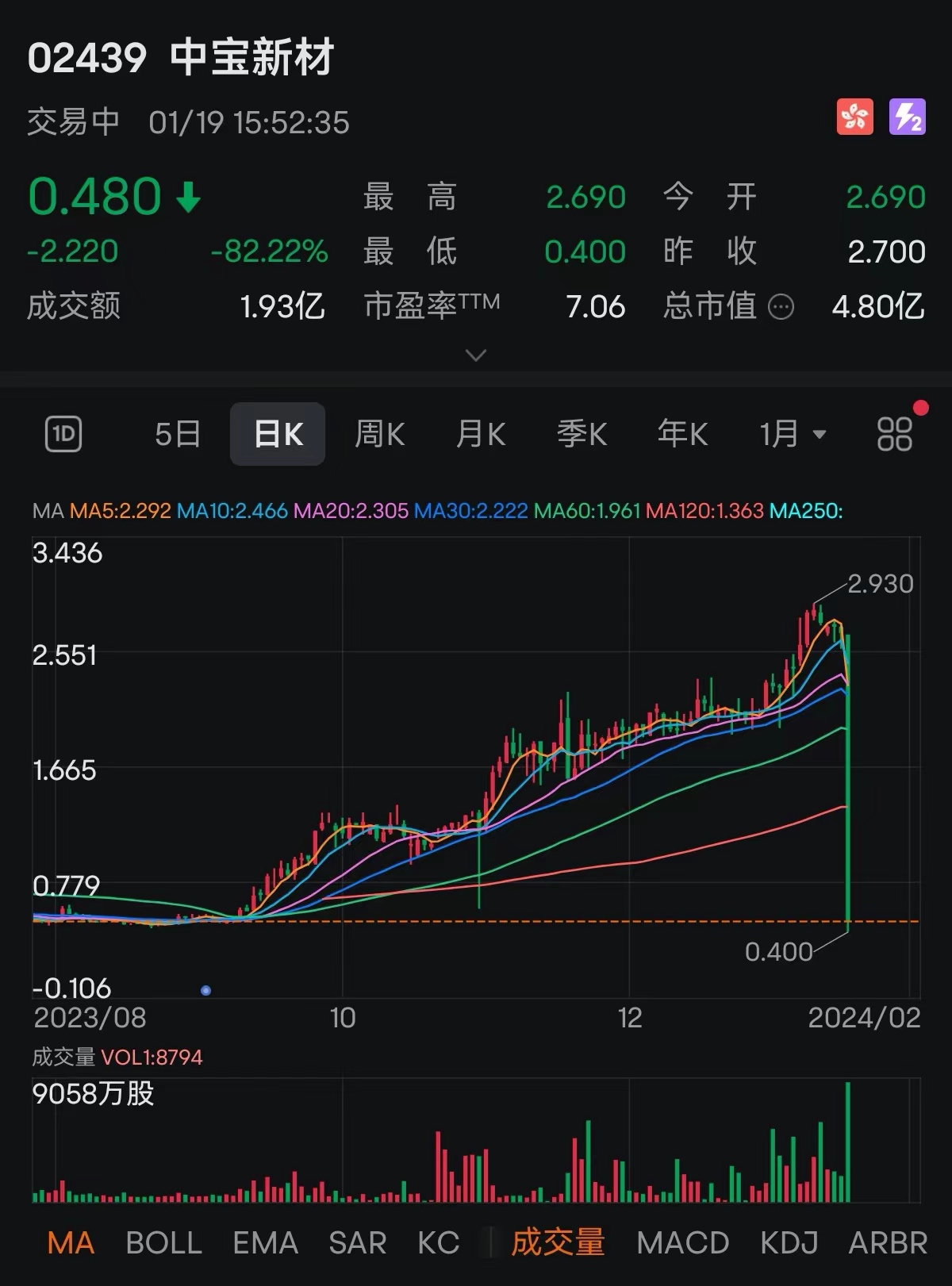 财联社1月19日电,中宝新材(02439.HK)尾盘急跌,截至发稿跌82%,成交1.94亿港元。该公司主要业务是在中国东北地区开发和制造生物降解塑料产品,此前近4个月股价最大涨幅近5倍。