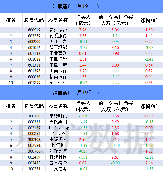 财联社1月19日电,北向资金今日大幅净卖出52.09亿元。隆基绿能、比亚迪、美的集团分别遭净卖出3.75亿元、3.39亿元、3.19亿元。贵州茅台净买入额居首,金额为7.76亿元。